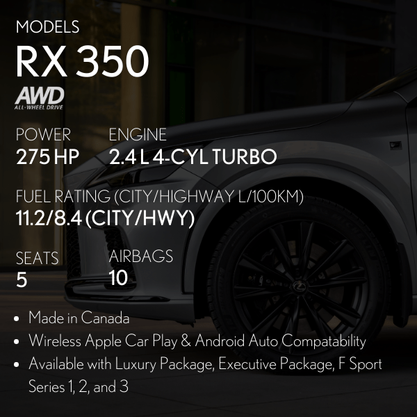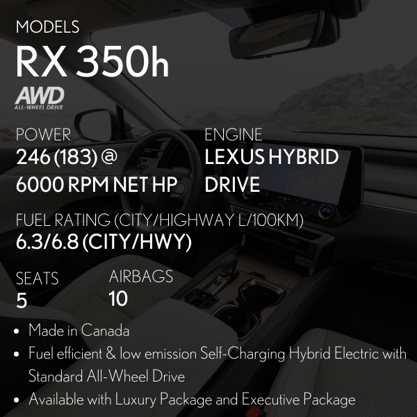 Three new powertrains will be offered in the all-new RX, including the RX 350 AWD with 2.4L turbocharged inline-4-cylinder or two electrified options. The Lexus electrified lineup provides exhilarating performance while contributing to a carbon-neutral society.