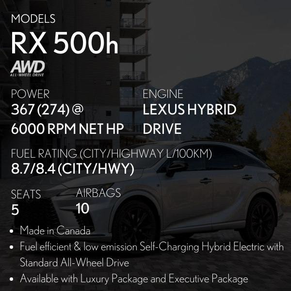 The RX 500h F Sport Performance delivers a sportier look and feel. This encompasses a new hybrid electric system and innovative DIRECT4 AWD System that provides ultimate grip, traction and acceleration. This model also extends a wealth of features like a perforated leather-trimmed steering wheel with paddle shifters, suede-interior door trim, F SPORT scuff plate, leather trimmed interior, aluminum interior trims including pedals and more.