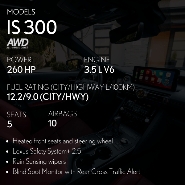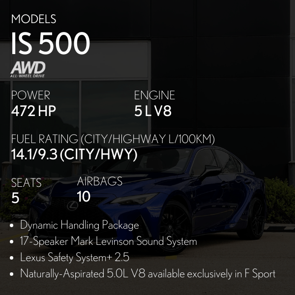 Exuding a captivating design. Delivering nimble performance. Indulging your senses with every press of the accelerator and enriched with state-of-the-art technologies to foster enhanced connectivity and safety through Lexus Safety System+ 2.5. Offering two AWD models and two RWD models, including the formidable 472 horsepower Lexus IS 500 RWD F SPORT Performance. The 2023 IS stands ready to respond to your beck and call.